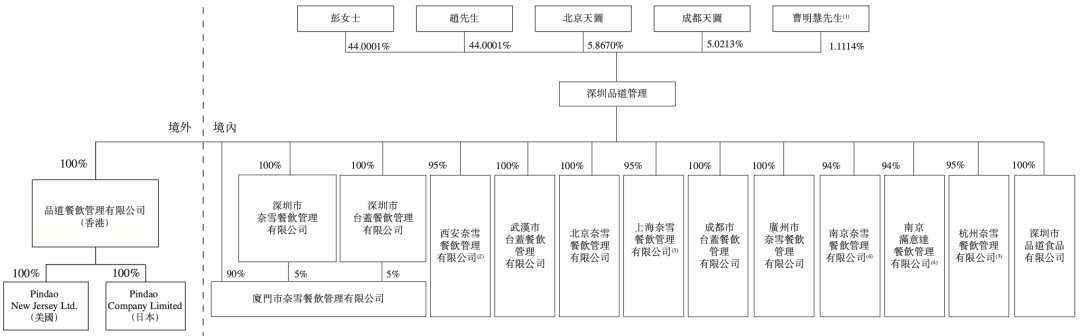 实际上,深圳品道管理作为整个业务运营的主体,是一家股权结构并不算复杂的内资公司。而最终公开发行前,奈雪重组后的架构如下: