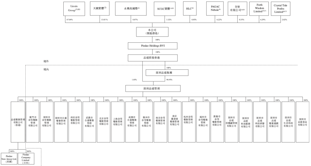 林心控股为一家控股公司,由奈雪的创始人夫妇分別最终拥有50%及50%股权。整个Linxin Group的投票权,由创始人夫妇赵林及彭心行使。
