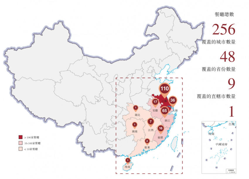 截至最后实际可行日期,七欣天在中国9个省的48个城市以及1个直辖市经营256家直营餐厅。其中,二、三线及以下城市的餐厅数为145家,占总餐厅数量的约56.6%。