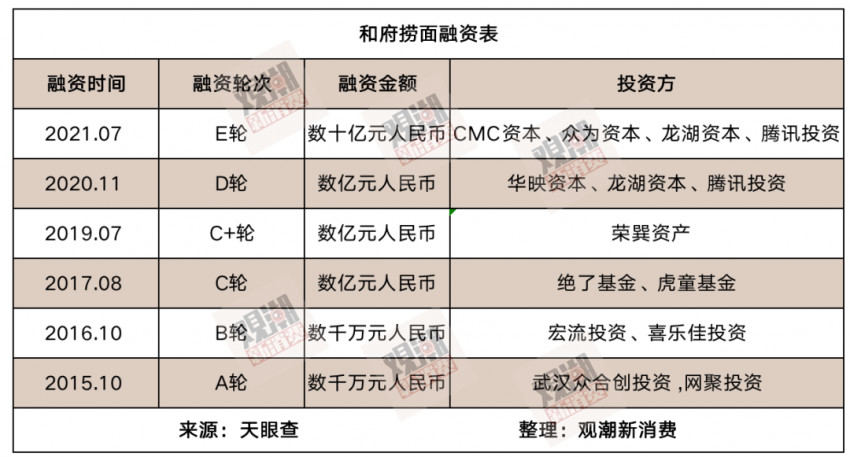 这一成绩也吸引了资本的注意,从2015年到2021年,6轮融资让和府捞面拿到了16.45亿元的金额;当腾讯也开始吃面,连续两轮跟投,再次证明了这碗面有多香;2021年,完成了E轮融资的和府捞面估值更是达到了70亿元人民币。
