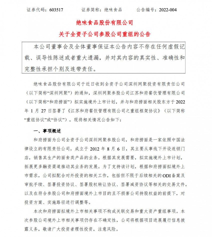 日前,绝味食品发布公告称,该公司全资子公司深圳网聚投资有限责任公司(下称“深圳网聚”)参股的江苏和府餐饮管理有限公司(下称“和府捞面”)拟实施境外上市计划,和府捞面或将于今年冲刺港交所。