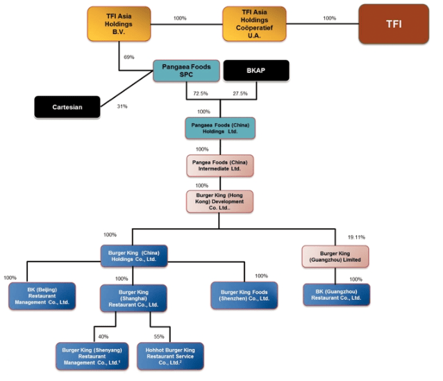 汉堡王(中国)投资有限公司由一家名为“BK(Hong Kong )Development Co., Limited”的公司全资持有。2017年,TFI曾经谋求赴美上市时,其向SEC递交的招股文件显示BK(Hong Kong)Development Co., Limited由Pangaea Foods (China) Holdings, Ltd.全资持有。根据后者股权穿透图,其72.5%的股权由TFI和笛卡尔组建的合资公司持有,其余27.5%股份由RBI子公司BKAP(BK Asiapac Pte. Ltd)持有。