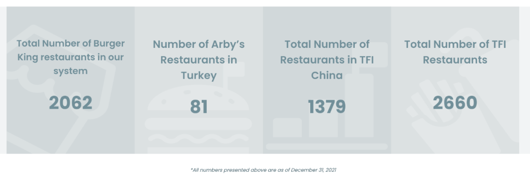 经过10年发展,由汉堡王、Popeyes品牌组成的中国业务,已成为TFI全盘生意中举足轻重的一部分。根据其官网数据,截至2021年12月31日,TFI已开设2660家餐厅,其中过半都开在中国,数量达1379间。