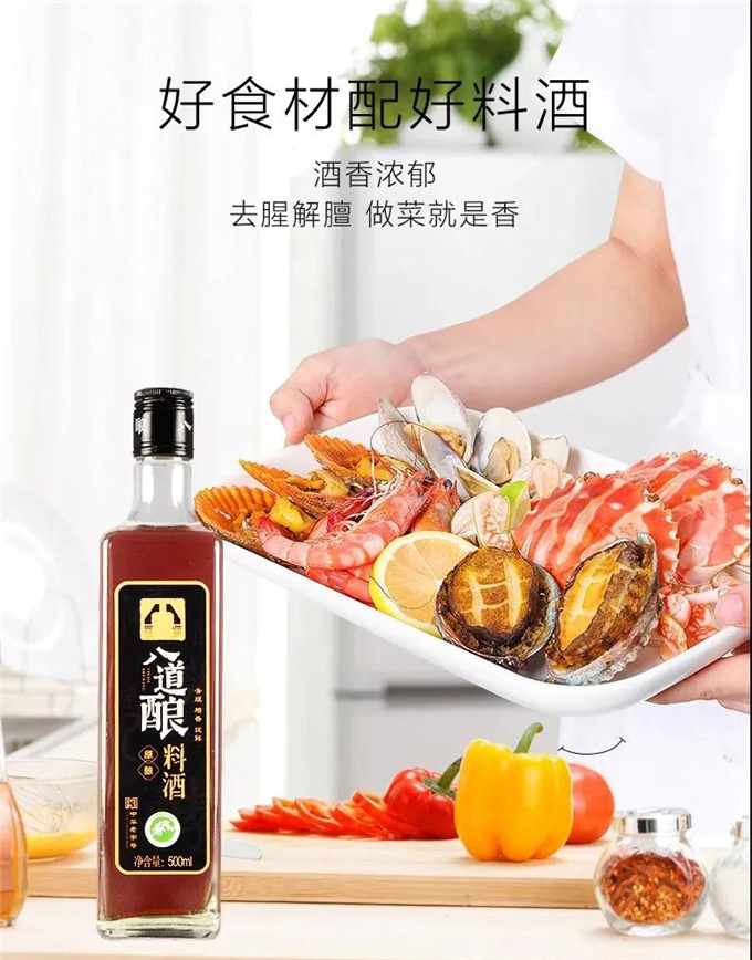作为料酒产业的匠心之作,八道酿坚守纯粮自然酿造的高品质路线,精选优质大米为原料,经过八道(浸、蒸、酵、耙、沉、榨、煎、陈)传统工艺自然发酵,足时陈酿而成,酝酿出自然本身的醇厚与鲜香,产品色泽澄亮,酒香浓郁,酒体醇厚,具有突出的去腥去膻、增香提鲜、丰富菜肴整体风味的作用价值。