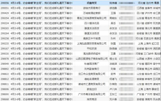 再次,80后、90后的商业代表,积极拥抱电商、拼团、直播等新模式渠道商,布局电商、B2B及餐饮供应链、超市自有品牌等新渠道的经销商群体也将悉数到场。 成都礼遇天下主流经销商报名表单(部分)