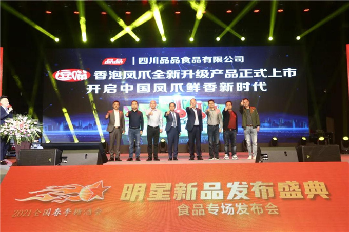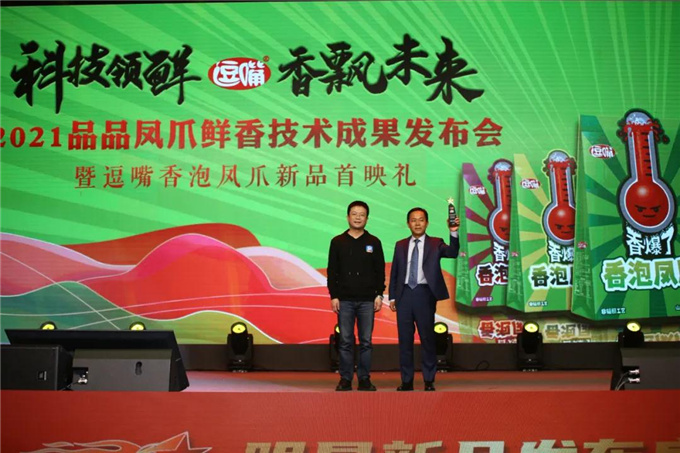 在新品发布盛典现场,四川品品有限公司就带来了新的惊喜。“科技领鲜,香飘未来”——2021品品凤爪鲜香技术成果发布会暨逗嘴香泡凤爪新品首映礼,揭秘了“品品食品”非辐照专利鲜香技术,发布逗嘴香泡凤爪全新产品,多位大咖现场强力助阵,助力品品食品引领中国凤爪行业迈入鲜香时代。
