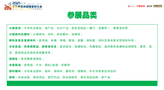 大会参展品类包含米面粮油、调味品、速冻米面、火锅料、肉类调理品、预制菜、水产调理品等7大产业30个细分品类。