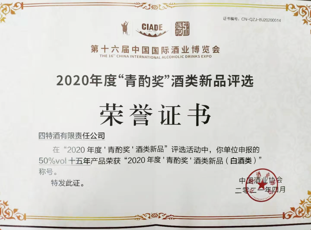 近日,由中国酒业协会主办的2020年度“青酌奖”酒类新品评选在泸州市举行。本届“青酌奖”酒类新品评选汇聚了各大品牌的年度新品。三百种白酒新品同台竞技、各展风采,经过专业评委会层层评选,50%vol四特十五年脱颖而出,成功斩获中国酒类新品奖——“青酌奖”。