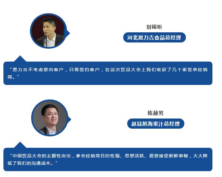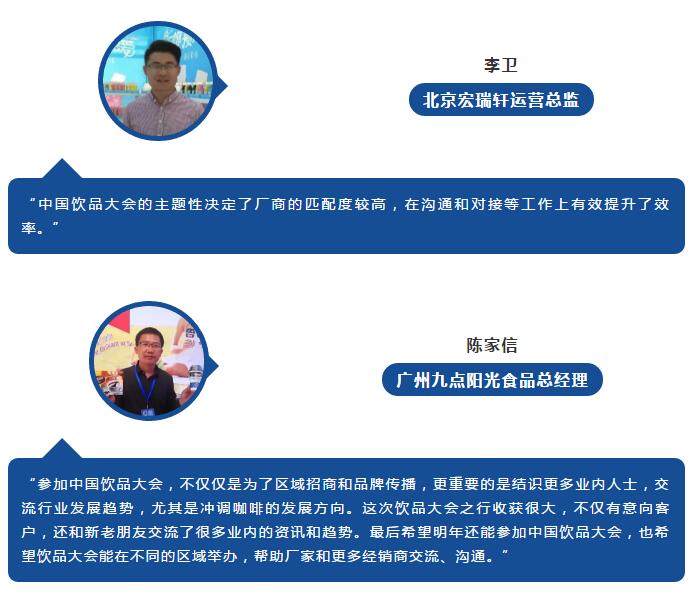 当然不止这些,往届参与饮品大会厂商朋友们纷纷给予高度评价:现场经销商人流量大、企业整体质量规模都很高、名副其实的行业盛会……我们也非常高兴获得了大家的认可,并不断努力,今年中国饮品大会更是全新升级。