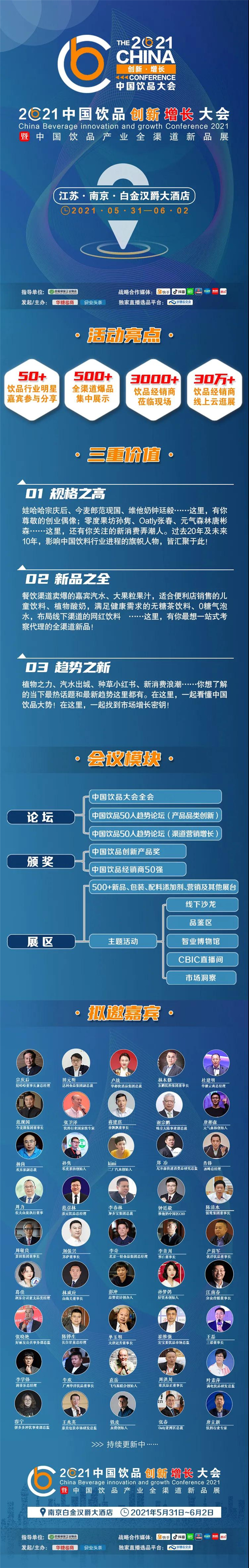 没错,5月31日-6月2日,万众瞩目的2021CBIC中国饮品创新增长大会(简称“中国饮品大会”)将在江苏南京拉开帷幕。本届中国饮品大会以“创新·增长”为主题,指明创新方案,提供增长方案。大会规格之高、饮料新品之多、商业资源之准,是2021年饮品行业内当之无愧的行业盛会。