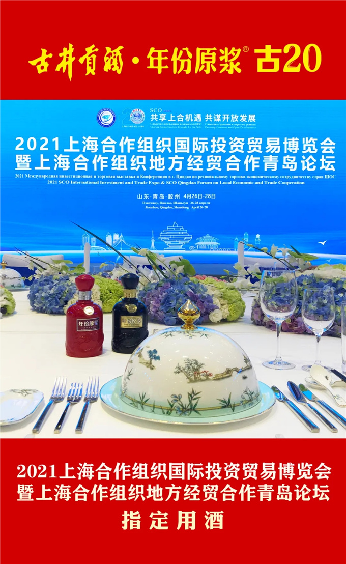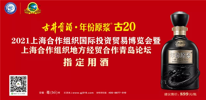 今年正值上海合作组织成立20周年。在这特殊有纪念意义的年份里,2021上海合作组织国际投资贸易博览会暨上海合作组织地方经贸合作青岛论坛指定用酒“古井贡酒年份原浆古20”,热烈祝贺大会盛开青岛签订20个合作项目、投资额668亿元,为庆祝上合组织成立20周年献礼!