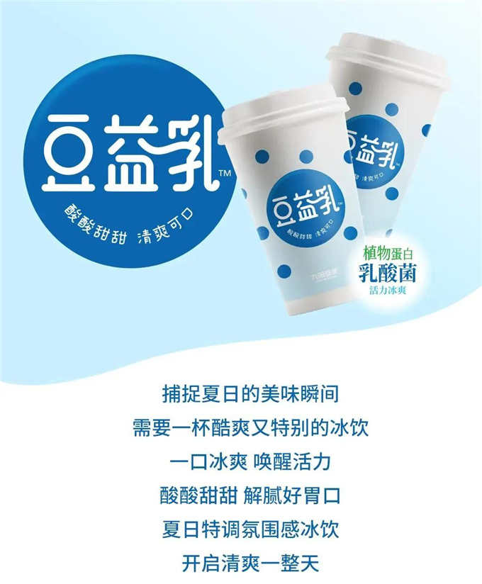 豆益乳:豆浆与益生菌的全新碰撞!以非转基因大豆为原料,具备天然植物营养的品质基底,同时添加保加利亚乳杆菌、嗜热链球菌双菌种,益生菌与植物奶双料组合,不仅让产品口感更具酸甜风味,同时让一杯豆浆更添功能价值,作为2021夏季主打的冰饮爆品,九阳豆益乳解腻夏日好胃口,带来酷爽新体验。