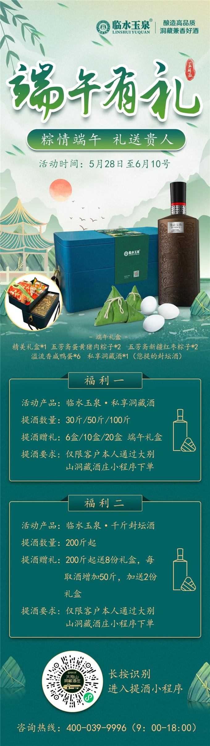 凡是购买临水玉泉·私享洞藏酒的客户,在活动期间通过大别山洞藏酒庄小程序下单取酒30斤,即享临水玉泉足年洞藏定制端午礼盒6盒,取酒50斤,即享端午礼盒10盒,取酒100斤,即享端午礼盒20盒。