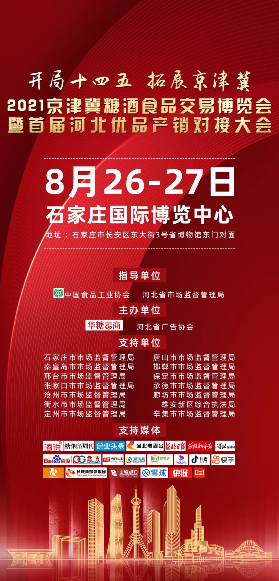 从官宣海报来看,2021京津冀糖酒食品交易博览会暨首届河北优品产销对接会在中国食品工业协会和河北省市场监督管理局共同指导下,由河北华糖云商营销传播股份有限公司、河北省广告协会联合主办。除了涵盖包括河北电视台、河北日报、燕赵都市报、糖烟酒周刊、酒说、食业头条等在内的头部媒体大力支持外,本次峰会重要的一个亮点是:覆盖河北全省14家市场监督管理局的力挺。