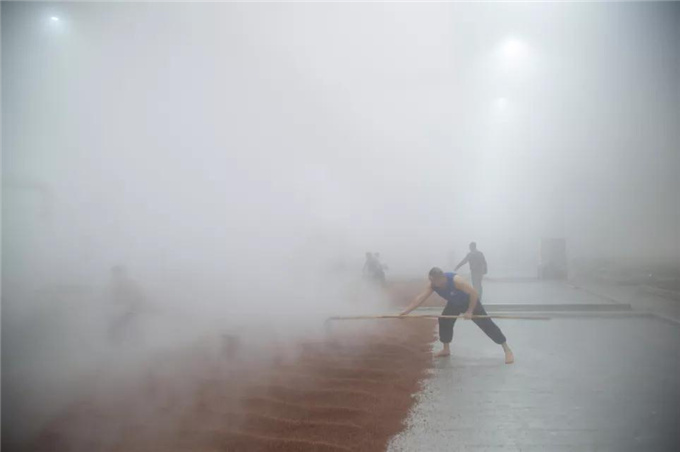 一堆人在酿酒车间旁围了一圈,一会儿抿酒咂嘴,一会儿眯着眼睛回忆往年的酿酒岁月:“这个酒杂味少”“就这个味”“这个酒巴适”“现在更好了”……在他们旁边,一片一片的高粱被摊晾开来冒着水汽,像是在大口大口地吞吐喘气。