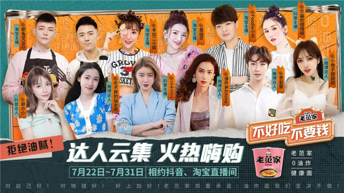 其次是玩转年轻的营销。老范家0油炸健康面优势明显,但要打入年轻人内部,还要把故事讲好。为此,今麦郎在7月23日至8月1日开启“不好吃不要钱”的特别活动,产品陆续登陆抖音、淘宝等KOL直播间,并宣布“在活动期间,消费者在指定的今麦郎旗舰店、今麦郎食品旗舰店、今麦郎官方旗舰店购买老范家0油炸健康面,收货后口味不满意可在签收7日内退款。”