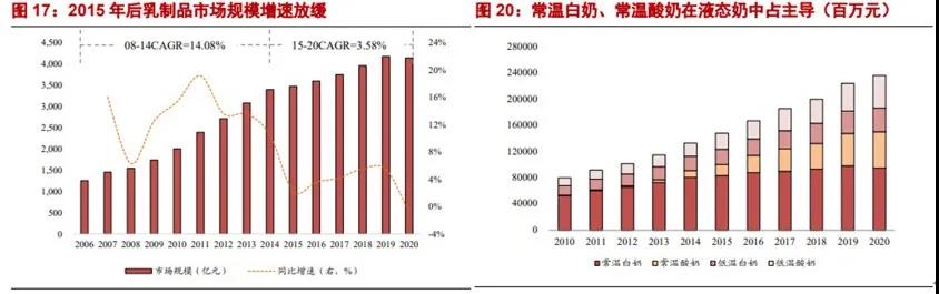 在国内4100亿的乳品市场中,低温鲜奶和低温酸奶两个品类占比为21%,并在近五年保持高速增长。浙商证券数据显示,2020年低温酸奶和低温鲜奶的市场规模分别约为500亿元、361亿元,近五年复合增速分别为CAGR15.43%、CAGR9%,而整个乳品行业过去五年的年复合增速为3.7%,低温奶的增速超过了行业整体水平。
