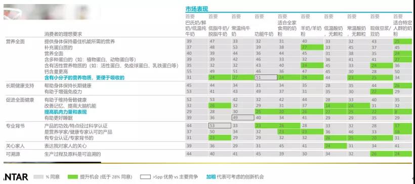 在消费升级、健康意识提升的趋势下,人们可能提升对低温鲜奶的消费需求,从而替代常温奶消费。凯度咨询在对市场上各类乳品进行调查时发现,多数乳品在某个方面存在提升空间,其中巴氏奶/鲜奶/低温纯牛奶产品的各项指标均处于较高水平。