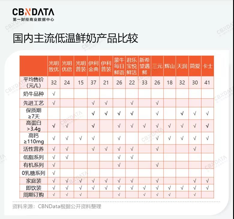 从各品牌低温鲜奶产品及售价的对比情况来看,高蛋白、高钙已不能成为高端鲜奶的评价标准,而是成为了市面上鲜奶产品的标配。比如国标要求蛋白质含量为2.9g/100ml,大多数鲜奶产品均做到了3.6g/100ml,有的还做到了3.8g/100ml,保质期也从7天延长至10-19天。当前,市场上有多款鲜奶同时具有15天左右的保质期、蛋白含量高达3.8g/100ml、保留多种活性营养等特征。另外,针对不同人群需求细化产品线也成为高端鲜奶的另一个特征,很多乳企都增设有机、低脂、0乳糖等鲜奶产品线。