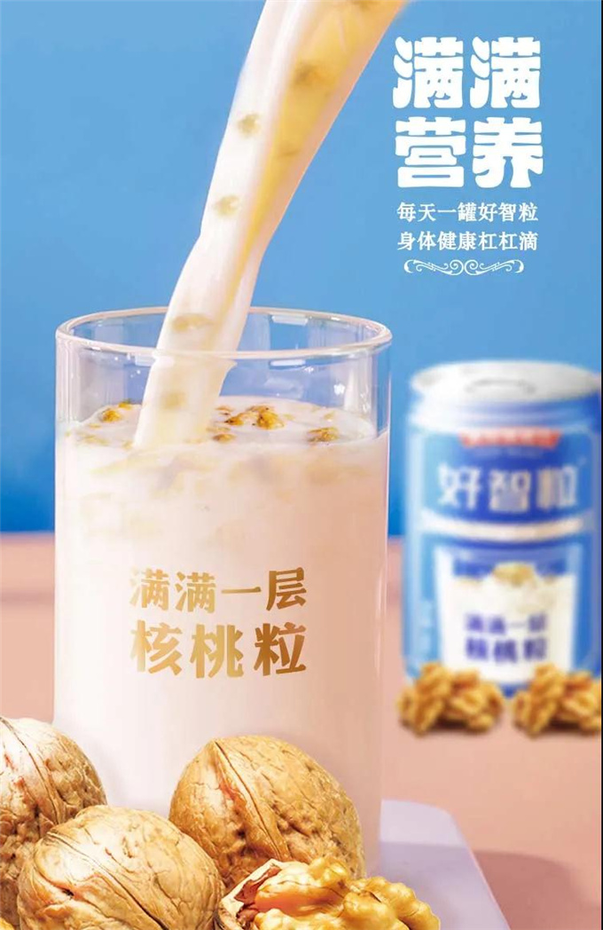 相比传统的核桃乳产品,好智粒在不同维度实现了迭代升级:概念升级,在行业里率先打响“颗粒核桃乳”概念,给人耳目一新之感;品质升级,核桃原料来自新疆、云南核桃黄金产地的农垦供应基地,每一个都是优中选优;技术升级,突破了颗粒漂浮的技术瓶颈,核桃粒漂浮不沉底,消费者每一口都能嚼到核桃粒;口感升级,相比于普通核桃乳寡淡的口感、甜腻的口味,好智粒颗粒核桃乳的口感更复合、更立体,滴滴细腻爽滑,颗颗浓香软糯;包装升级,引入大量“中国风”设计元素,尽显国潮时尚格调……