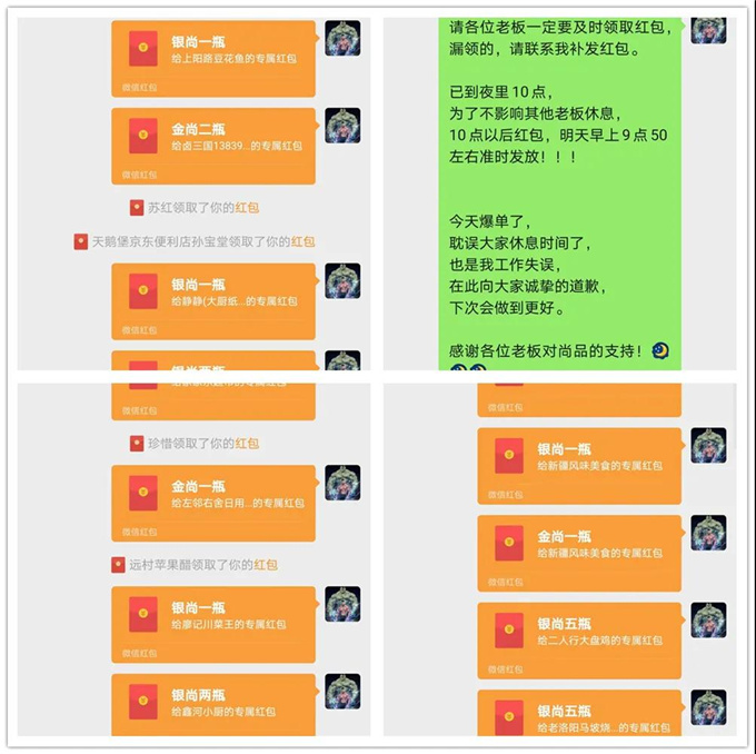 第一重是红包等激励政策。只要是终端有动销,商家就会领取到相应的红包激励。而且终端商每天卖够5瓶以上,还会得到一箱冰红茶或啤酒等激励,这些政策大大助力了商家推广的热情;第二重每天固定时间都会在社群进行抽奖,手气好的商家可或得相应奖励;第三是周奖励政策。每周动销前三名的商家会得到相应金额的现金奖励;第四是让利终端,而这也得益于厂家的大力支持。