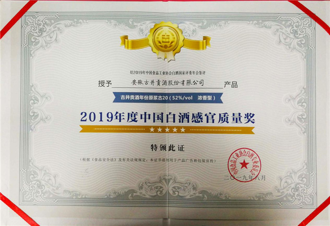 52度年份原浆古20荣获中国白酒感官质量奖