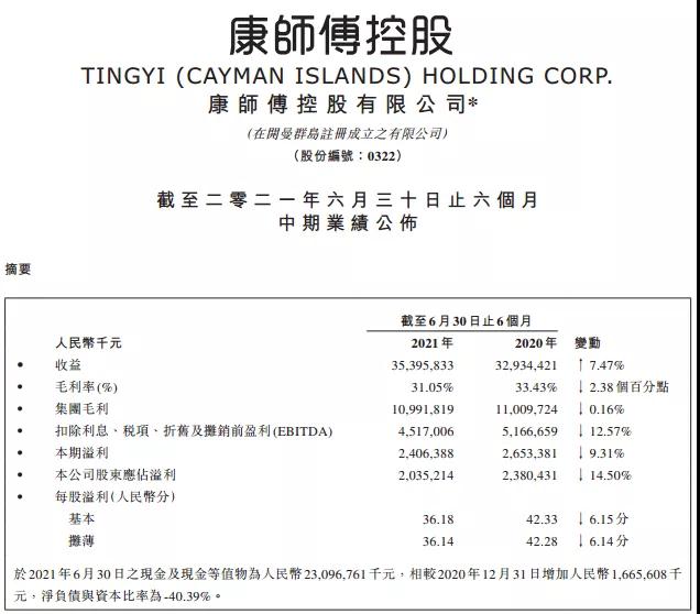 其中,康师傅营收353.96亿元,比去年同期上升7.47%;期內毛利率同比下降2.38个百分点至31.05%。分销成本占收益的比率同比上升1.68个百分点至21.42 EBITDA,同比下降12.57%至45.17亿元。