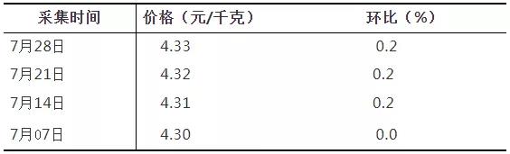 据农业农村部监测数据,7月以来生鲜乳价格连创新高,最后一周已达到4.33元/公斤,比前一周上涨0.2%,同比上涨19.0%;月度均价4.32元/千克,环比上涨0.9%,同比上涨19.2%。玉米月度均价2.98元/千克,环比下降0.9%,同比上涨28.6%。豆粕月度均价3.75元/千克,环比上涨0.2%,同比上涨15.9%。