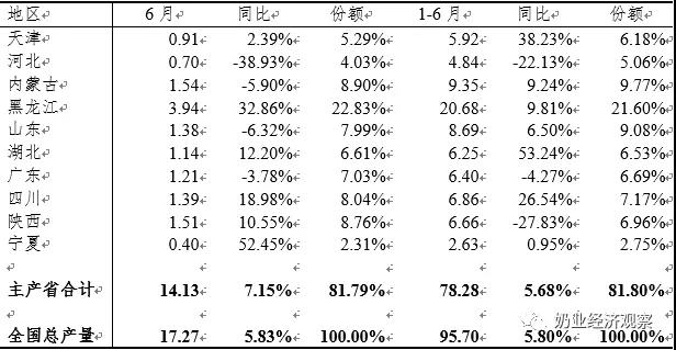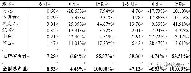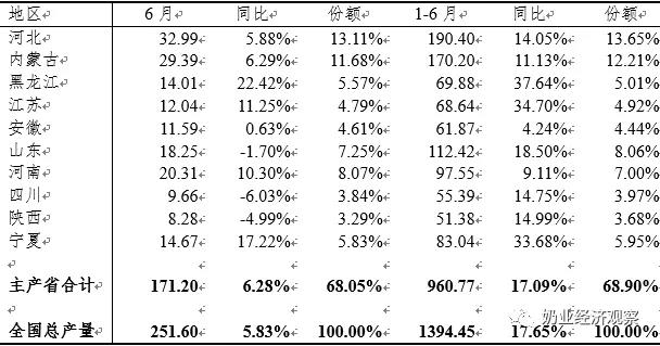1-6月,奶粉产量前六省份中,只有内蒙古、黑龙江产量同比增长,合计39.36万吨,同比下降4.74%,占全国总产量83.51%。其中黑龙江为19.76万吨,同比增长9.39%,占总产量的41.91%,居第一位。6月,这六个省份中,黑龙江、陕西产量同比增长,合计7.28万吨,同比增长6.64%,占当月全国总产量的85.37%。其中黑龙江为3.81万吨,同比增长29.09%,占当月全国总产量的44.67%。