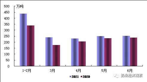 2021年1-6月,全国干乳制品产量95.70万吨,同比增长5.80%