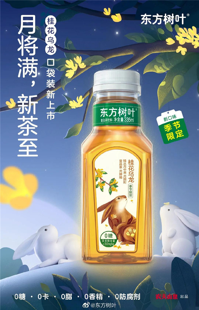 作为一款秋季限定,东方树叶桂花乌龙由金桂搭配福建乌龙,乌龙醇厚甘爽,又可调和桂花的甜腻感,二者相得益彰,使得茶品香气和口感别具特色。透明包装的专利技术和无菌冷罐技术,让产品在无防腐剂添加的前提下,做到存放数月,依然可以较好保持原有的色、香、味。与此同时,东方树叶0糖0卡0脂0香精0防腐剂工艺标准,使得饮茶更健康,也践行了东方树叶一直秉持的还原健康自然状态的产品理念。 东方树叶的包装也尤为值得一提,用经典插画的风格来演绎东方美学故事,不仅十分精致,又有很强的记忆点。此次的新品桂花乌龙,以“玉兔折桂”作为主要画面,加之乌龙茶金黄透亮的底色,更从视觉上加强了消费者对桂花乌龙和秋天的关联记忆。