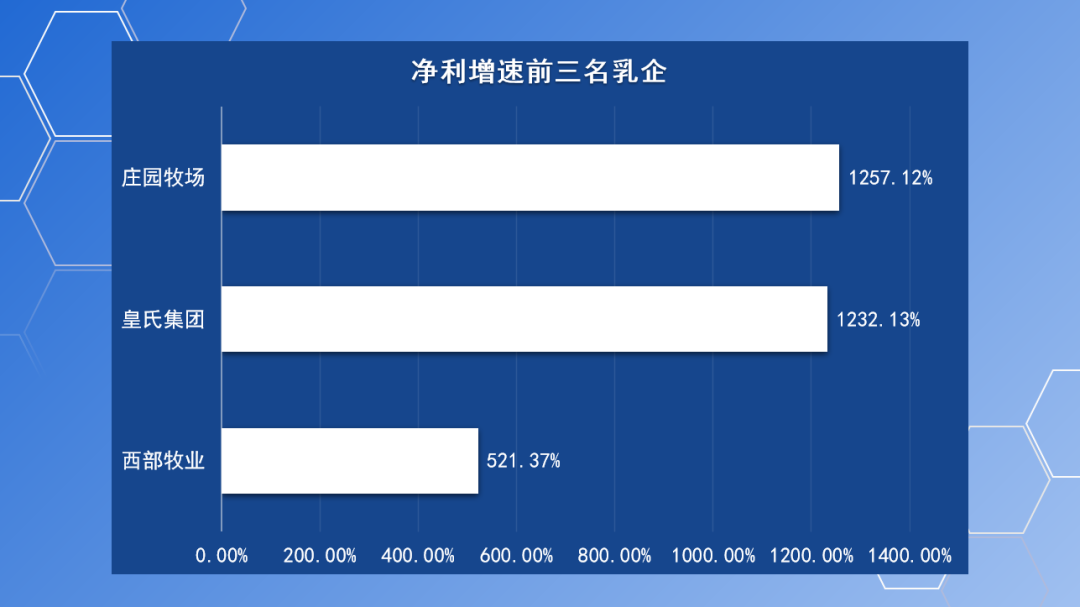 利润增长快的是庄园牧场,净利提高了1257.12%;其次是皇氏集团,净利同比增长1232.13%;第三是西部牧业,521.37%。