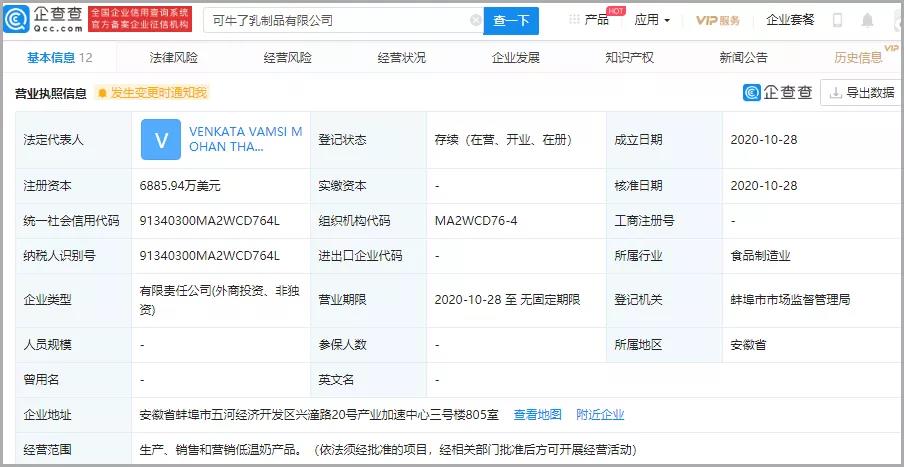 企查查App显示,可牛了乳制品有限公司注册资本为6885.94万美元,法定代表人为VENKATA VAMSI MOHAN THATI,经营范围包含生产、销售和营销低温奶产品等。该公司由内蒙古蒙牛乳业(集团)股份有限公司与可口可乐(中国)投资有限公司共同持股。