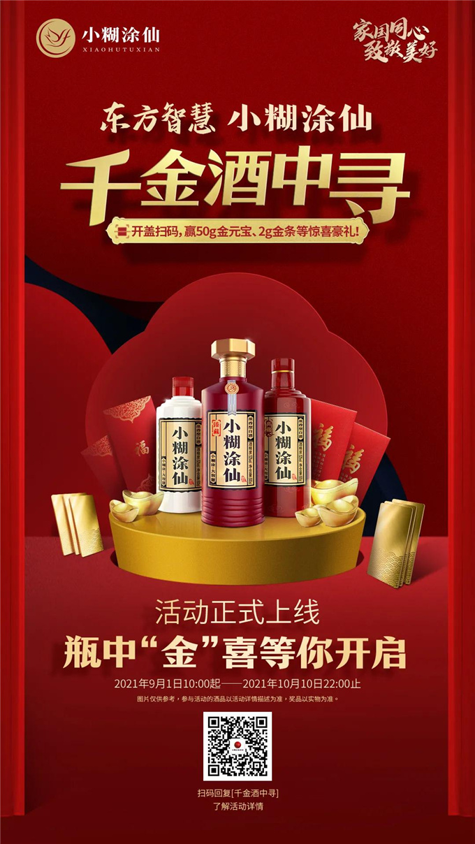 在9月开端,小糊涂仙便率先启动了双节营销布局,其中特别推出“千金酒中寻”活动,以“金”喜福利致敬美好生活。从9月1日到10月10日期间,凡购买小糊涂仙活动指定酒品,扫描瓶盖内的二维码就能参与活动,有机会赢50g金元宝、2g金条、微信现金红包等豪礼!