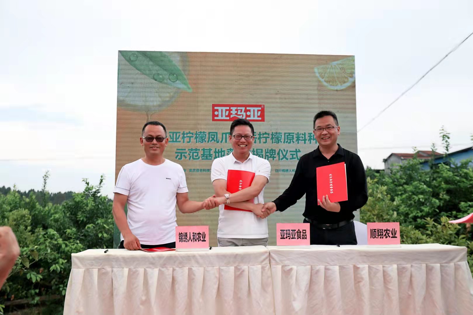 9月7日上午,“亚玛亚柠檬凤爪·四川安岳柠檬原料种植示范基地落成揭牌仪式”在安岳柠檬(伟杰)科技园区隆重举行。成都亚玛亚天然食品有限公司、四川顺翔农业开发有限公司、四川锦绣人和农业开发有限公司的企业代表,现场就基地建设进行了签约确认。