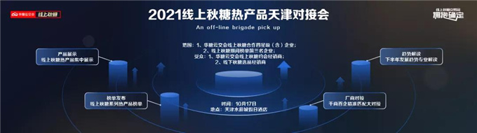 在线上展示之余,2021线上秋糖还为厂商朋友提供了一个线下的支点——“2021全国秋季糖酒会明星新品发布盛典暨线上秋糖热产品天津对接会”,与秋糖各酒店布展企业深度匹配,线上线下赋能互推,引爆行业新趋势!