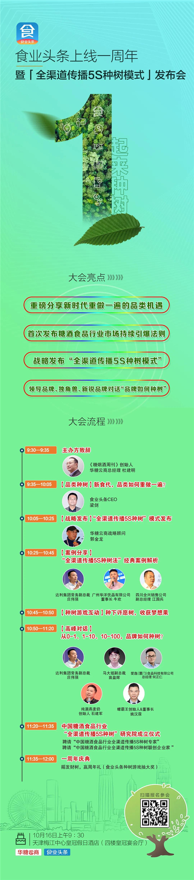 食业头条上线一周年暨“全渠道传播5S种树模式”发布会上有哪些特别环节?“全渠道传播5S种树模式”究竟是什么?会有哪些重磅嘉宾出席?食业头条马上为你揭晓: