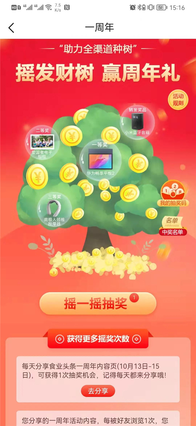 食业头条一周年活动即将来临,为感谢大家对食业头条的关注和支持,我们还为大家准备了周年礼:华为畅享平板2、爱国者电子相册、小米蓝牙音箱、颈椎按摩仪等丰厚奖品!