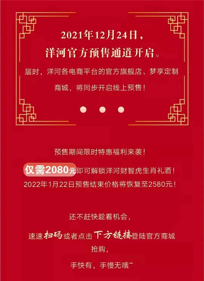 12月24日,洋河财智虎在洋河官方商城、各大电商平台的官方旗舰店、梦享定制商城同步开启线上预售,吸引了行业、名酒收藏家和众多消费者的高度关注。那么,洋河财智虎有哪些独特之处?为什么值得商家和消费者抓紧入手?