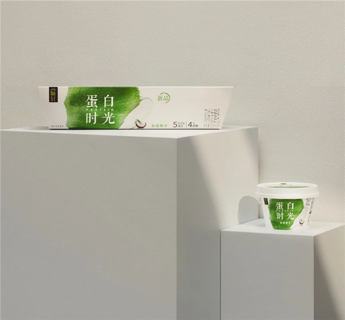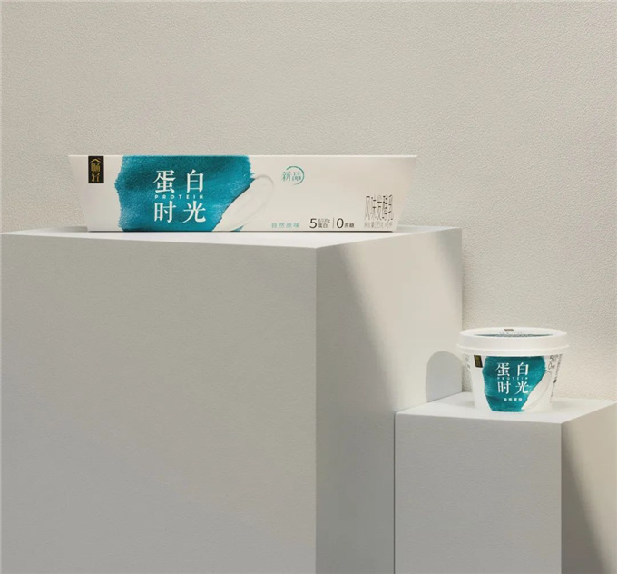 因此,在更“简洁”的配料、0蔗糖、无添加等已成高端酸奶“共识”的基础上,畅轻黑标蛋白时光旗帜鲜明地打出了“蛋白”牌。其中,金色高蛋白款蛋白质含量达到9g/100g,是普通酸奶的3.9倍,并且0 蔗糖、0 代糖,浓醇原味,只有天然牛乳回甘;蓝色自然原味和绿色丝绒椰子味每杯产品有5g蛋白,则是普通酸奶的1.6倍。