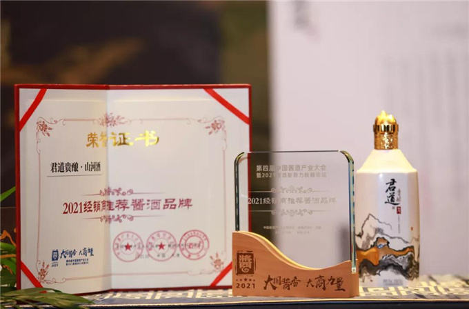 10月18日,在由华糖云商、酒说主办,以“大国酱香 大商力量”为主题的第四届中国酱酒产业大会暨2021酱酒新势力秋糖论坛上,君道贵酿·山河酒一举夺得“2021经销商推荐酱酒品牌”,获得这一荣誉的品牌需要具备三个条件。一是,该品牌必须获得经销商认可;二是,其在今年的市场表现中必须有较大突破;三是,品牌必须有很强的发展潜力。