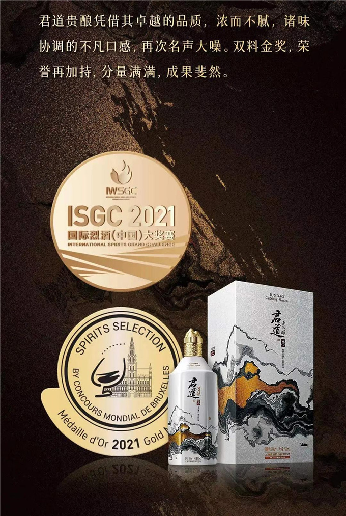 从产品品质来看,尽管君道贵酿推出市场的时间还不算太长,但已经斩获了无数荣誉。除了以上所介绍的行业认可外,其品质更是得到了重量级权威的认可。于2019年与2021年荣获比利时布鲁塞尔国际烈酒大赛大金奖、金奖殊荣;2021年10月,君道贵酿登陆CCTV《品牌责任》,讲述新时代更具竞争力和生命力的酱酒品牌故事……