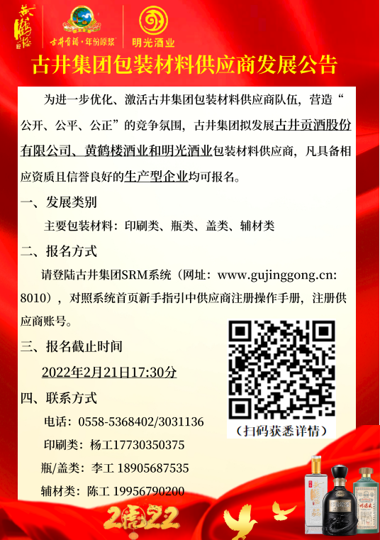 2月7日,春节开班第一天,古井集团在官网发布供应商发展公告,集团旗下安徽古井贡酒股份有限公司、黄鹤楼酒业有限公司、安徽明光酒业有限公司三大名酒企业,首次联合发展包装材料供应商。