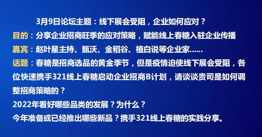 为了进一步释放“321线上春糖”的势能,助推厂家快速起跑。321线上春糖将从“加强社会化传播”、“十大品类论坛直播”、“热产品直播”、“企业自主直播”等方面进行造势,为企业招展赋能。