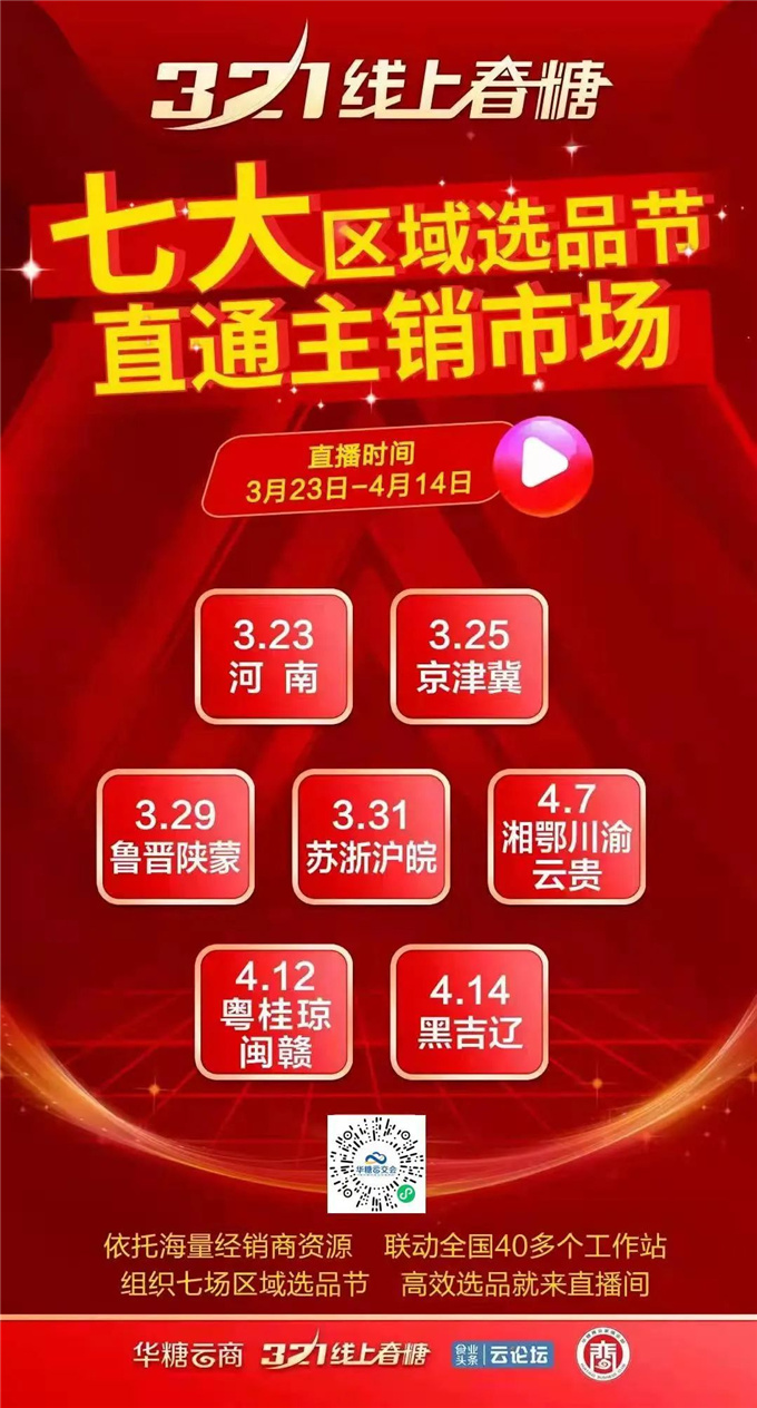 2022线上春糖策划七大区域经销商选品对接日,汇集河南地区、京津冀、两湖+西南、华南+江西、华东、山东山西陕蒙、东北全国七个大区,进行上线选品活动,集中时间、集中地区、集中精力邀请经销商上线选品,做好区域的渠道精耕!