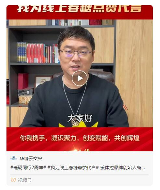 进行线上渠道精耕,积极开展线上布局,入驻线上春糖,取得了一定的硕果。在线上春糖2周年之际,乐体控品牌创始人高鹏发来了点赞祝福:“我与华糖云交会携手同行两周年,我为华糖云交会代言,我为线上春糖点赞!觅商机,选优品,就来线上春糖!”对于线上春糖平台的效果给与了肯定。