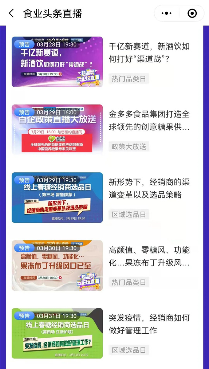 九大品类节、七大区域选品日、百企政策直播大放送、N场超级品牌日将持续、不间断地汇集名企大商、聚焦行业热点、剖析行业前景,为厂商带来行业趋势研判,新品展示、品牌推广、招商政策解读等热点内容。在为期一周的时间里,线上春糖已组织了26场云直播论坛。