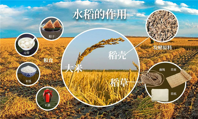在人类社会演化中,水稻也扮演了重要角色。社会生产层面,水稻的果实(即大米)可作为粮食食用,稻壳可作为发酵原料,稻草可以制成粗麻绳、草席、草纸,稻杆还可以制作成板材、生产肥料等;精神文明层面,大米的衍生物元宵、粽子、米酒被人们用来庆祝节日、追思先贤、宗教祭祀,满足精神追求。