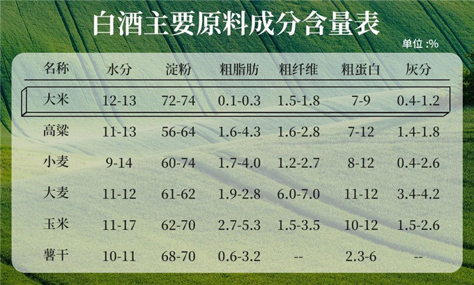 在白酒主要原料大米、高粱、小麦、大麦、玉米中,大米淀粉含量处于最高,蛋白质含量适中,脂肪含量处于最低,是理想的粮谷原料,用大米酿酒能够有较高的出酒率,在固态发酵过程中也表现得非常稳定。