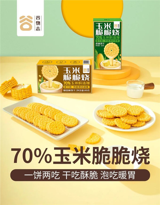 过去几年,随着健康减脂概念的普及,饼干行业经历了几年相对繁荣的产品创新期。但近一年来,我们接触到的一些各个品牌推出的新品抑或是新品牌,越来越趋向同质化且缺少新意。直到我们看到这款“谷物志玉米脆脆烧”产品,我们才坚定的觉得,只要用心去深挖,饼干类产品,还有很多能引起消费者共鸣的创新点可以挖!